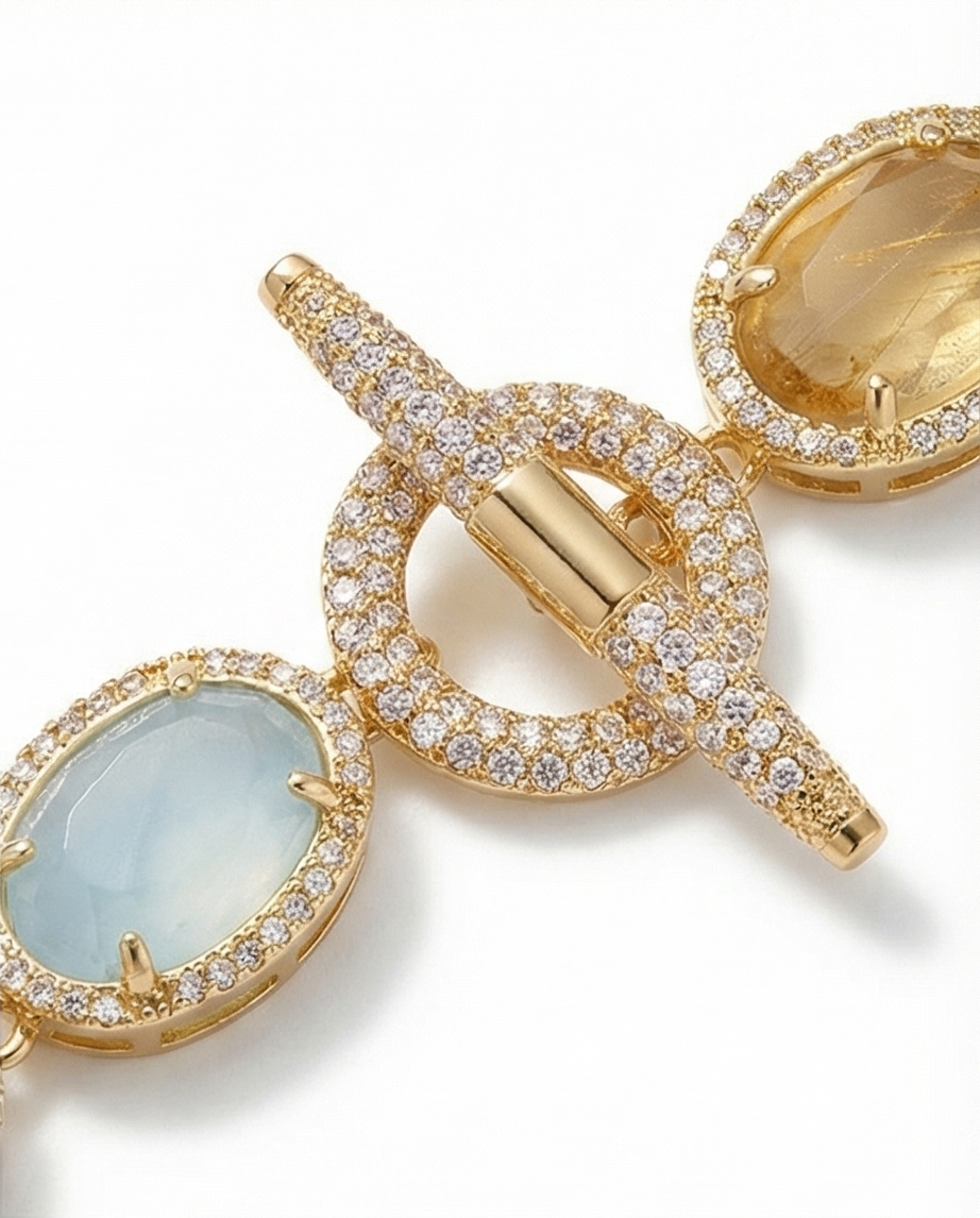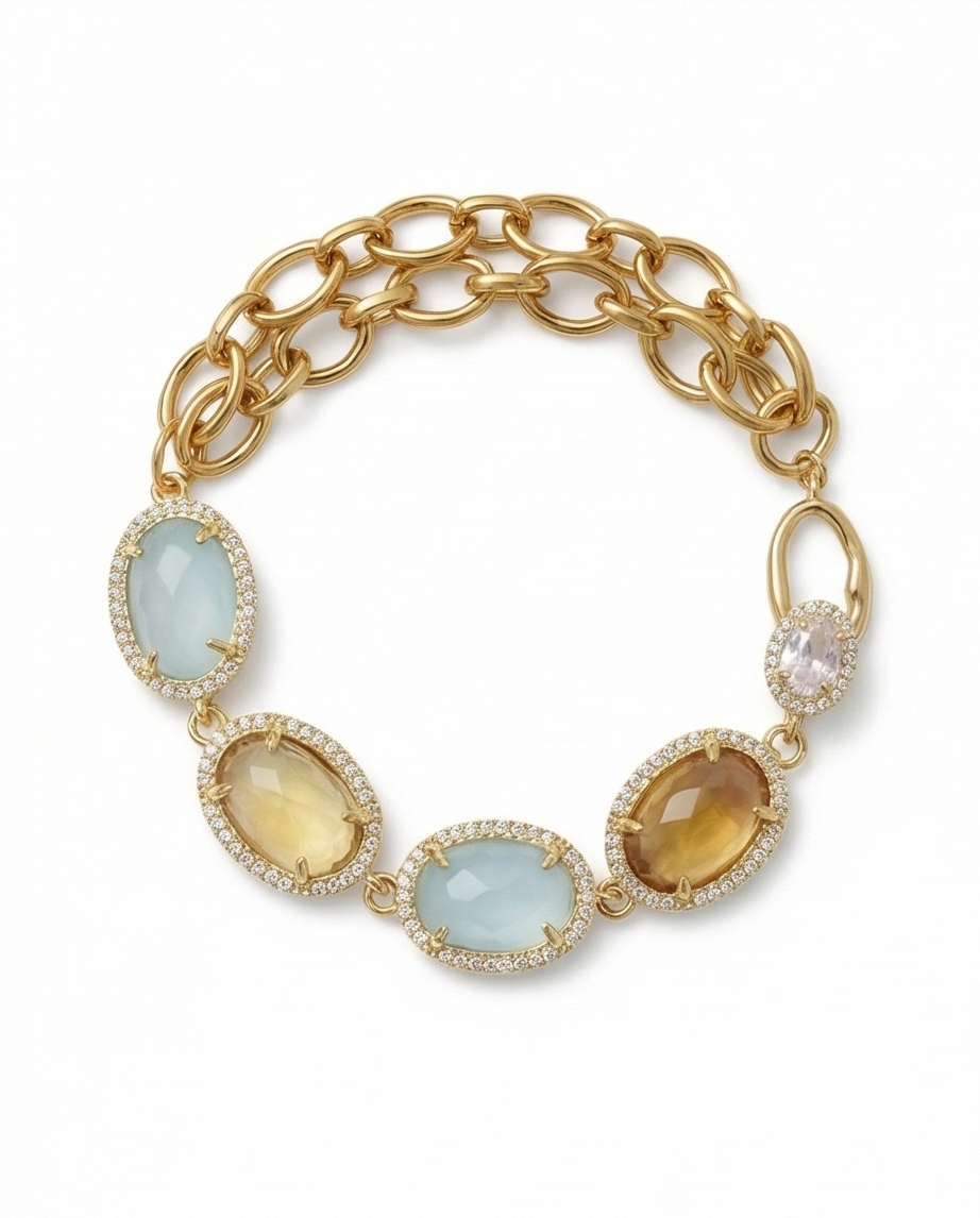 Experience the Ponza bracelet, an exclusive creation limited edition piece. This refined piece combines the warm glow of yellow fluorite with the tranquil beauty of powder blue chalcedony, elegantly strung on a graceful gold-plated oval chain. Each bracelet represents authentic Italian craftsmanship rooted in historic design traditions, meticulously executed to showcase both aesthetic excellence and cultural significance. A sophisticated accessory that honors your Italian heritage while delivering the timeless elegance discerning collectors seek.